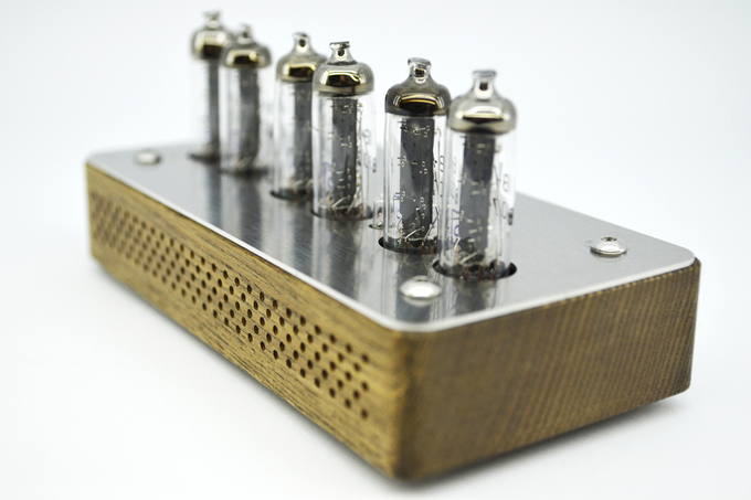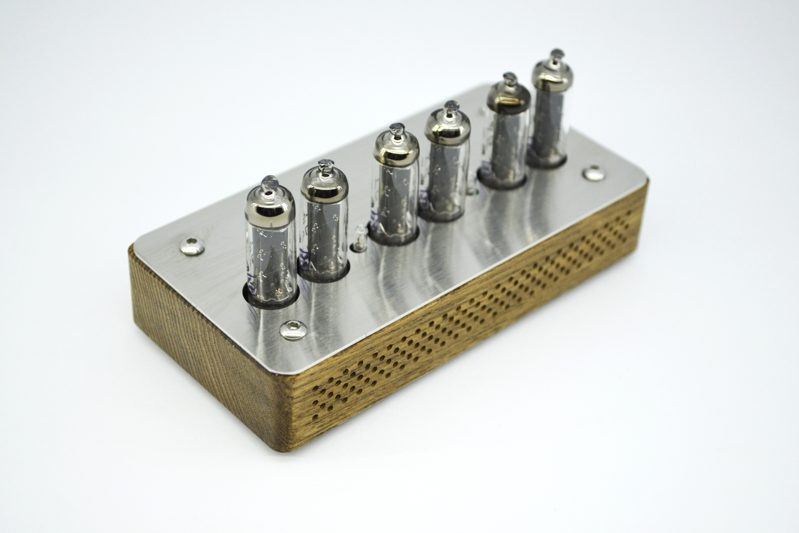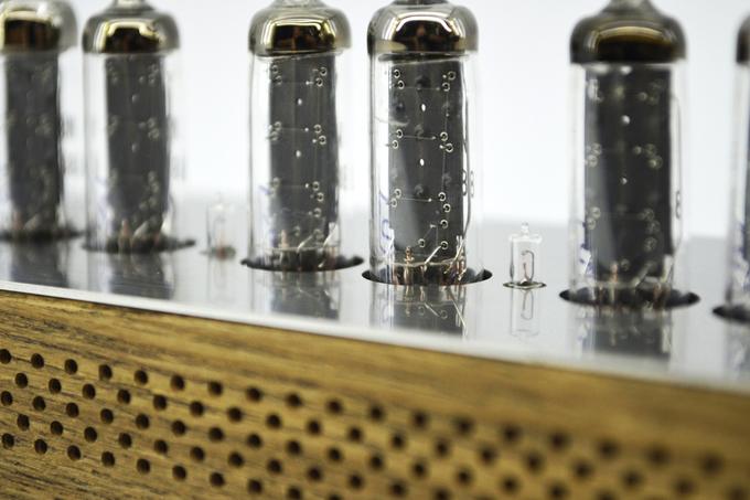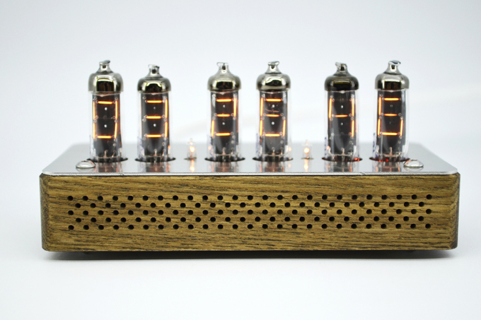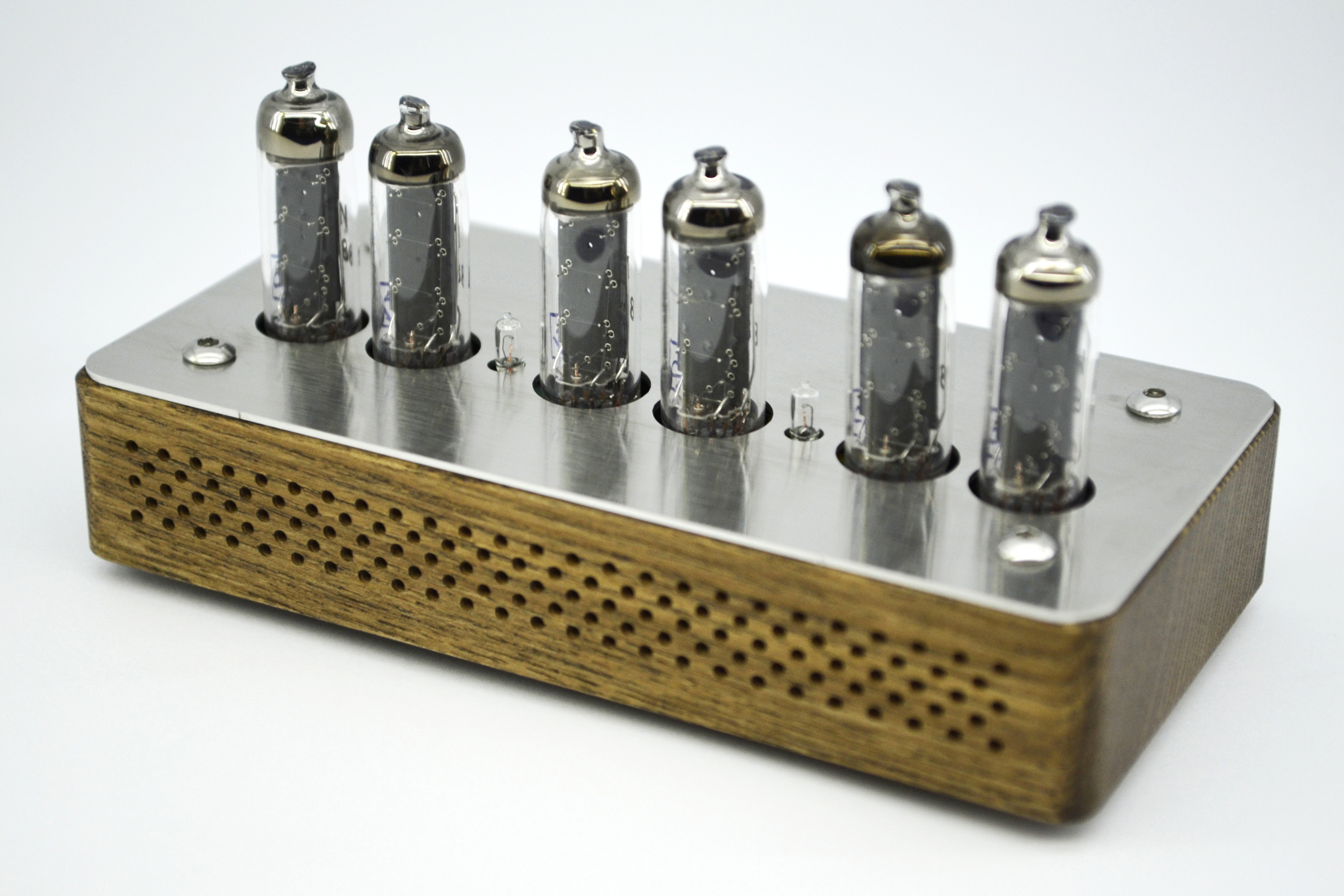 The clock is built with 6 numeric Numitron tubes and 2 tiny filament colot tubes.